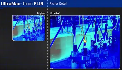 FLIR UltraMax and MSX are image processing technologies designed to substantially improve the clarity and usability of thermal images. UltraMax increases apparent resolution and reduces noise by combining multiple frames, while MSX overlays high‑frequency detail from a visible‑light sensor onto the thermal image to improve interpretability. Together they accelerate diagnostics, reduce false positives, and improve operator confidence in condition‑based inspections.